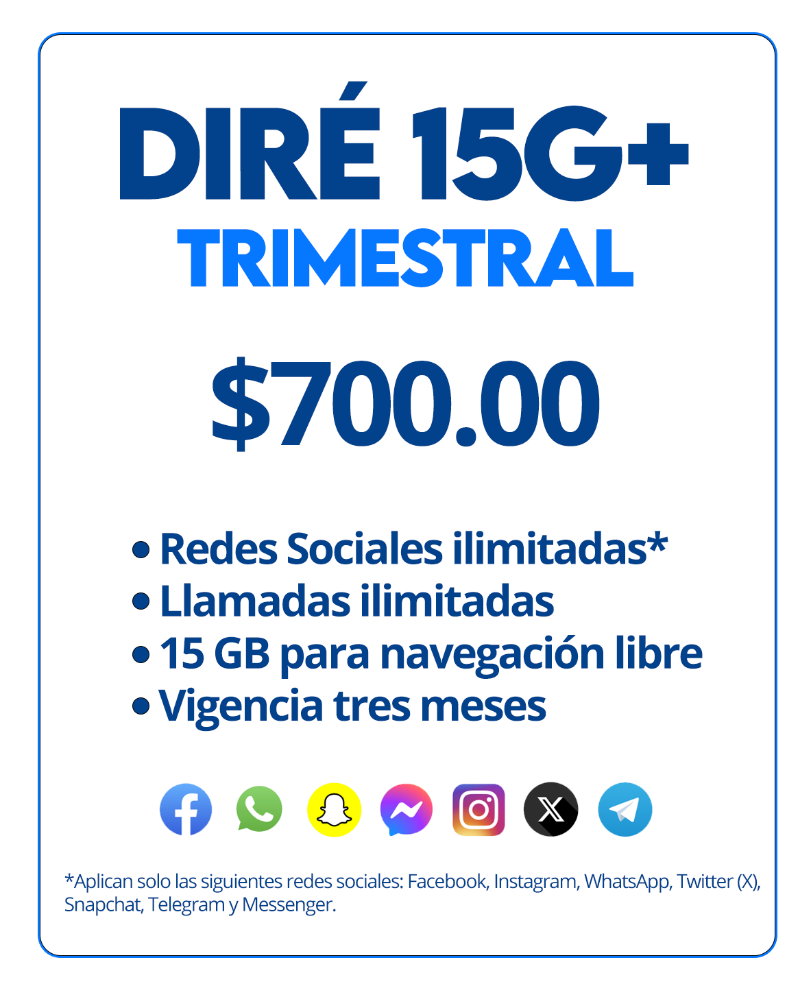 Paquete de 3 meses. Con 15 GB para navegación, minutos ilimitados, redes sociales ilimitadas, 1500 sms, comparte internet